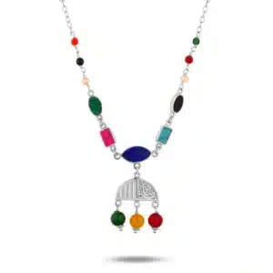 سلسلة من الفضة مع مجموعة متناسقة من الأحجار الملونة مع قالب كتب عليه كلمة ” سعادة”