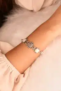 سوار من الفضة والاحجار البيضاء المربعة مع نقوشات ملهمة