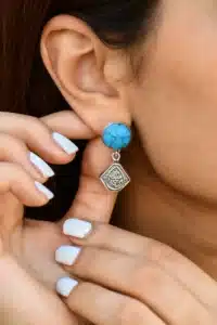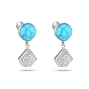 حلق من الفضة ومثبت به حجر الفيروز الرائع، ومتدلي منه شكل سداسي منقوش بعبارة رائعة.