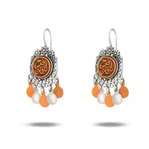 حلق من الفضة بتصميم رائع، مع نقش “افرح يا قلبي” بالإضافة إلى بعض الأحجار في نهاية ميدلية الحلق باللون الفضي والنحاسي.